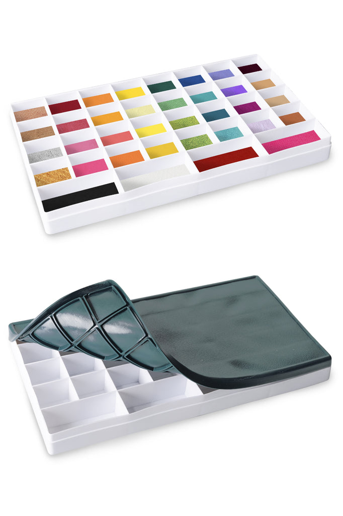 32 små och 4 större fack i en praktisk låda med ett silikonlock. Inget mer pillande med massor små lock. Det är bara att pytsa över dina färger från de små lådorna till denna stora så har du alla färger med dig i ett grepp, väldigt smidigt.